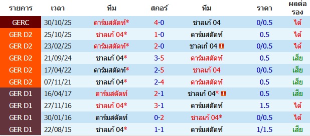 ดาร์มสตัดท์ เตรียมเปิดสนาม Merck-Stadion am Böllenfalltor ต้อนรับการมาเยือนของทีม ชาลเก้ 04 โดยเจ้าบ้าน ดาร์มสตัดท์ ของกุนซือ ฟลอเรียน โคห์เฟลด์ มีสถิติในบ้านที่ต้องใช้คำว่าสุดยอด เพราะไม่แพ้ใครในลีกที่สนามแห่งนี้มาถึง 14 นัดติดต่อกันแล้ว จุดเด่นที่สุดคือความสม่ำเสมอในเกมรุก ยิงประตูได้ทุกนัดตลอด 6 นัดหลังสุด รวม 12 ประตู สภาพความพร้อม ขาด มัทธิอัส บาเดอร์ ทางฝั่ง ชาลเก้ 04 ของกุนซือ มิรอน มิวสิค แม้จะชื่อชั้นใหญ่กว่า แต่ตอนนี้มีปัญหาที่เกมรับชัดเจน เสียไปถึง 9 ประตูจาก 6 นัดหลังสุด และเก็บคลีนชีตแทบไม่ได้เลย อย่างไรก็ตาม ยังมีเขี้ยวเล็บในแดนหน้าอย่าง เคนัน คารามัน ที่พร้อมป่วนแนวรับเจ้าถิ่น สภาพความพร้อม มีปัญหาหลายจุด รวมไปถึงการขาดกองหน้าตัวเก๋าอย่าง เอดิน เชโก้ ที่ติดโทษแบน ดูแล้วเกมนี้ สถิติ ดาร์มสตัดท์ ยิงประตูได้ทุกนัดในช่วงหลังและเล่นในบ้านได้ดุดันมาก ขณะที่หลังบ้าน ชาลเก้ รั่วแทบทุกนัด ประวัติการเจอกัน 6 นัดหลังสุดของคู่นี้ไม่เคยจบด้วยผลเสมอ 0-0 เลย เชื่อว่าเจ้าบ้านจะลุ้นชนะได้ด้วยเกมรุกที่เฉียบขาดกว่า