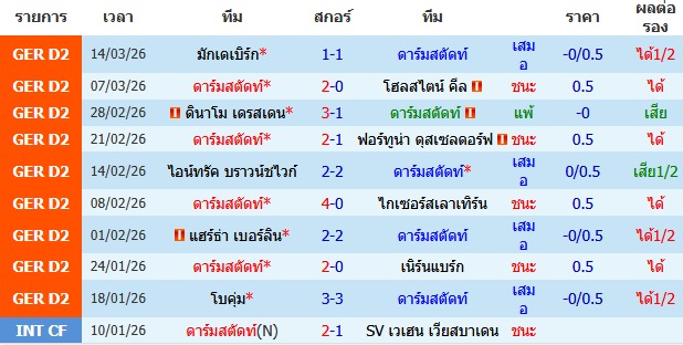 ผลงาน 10 นัดหลังสุดของทีม ดาร์มสตัดท์