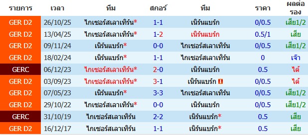 เนิร์นแบร์ก เตรียมเปิดสนาม Max-Morlock-Stadion ต้อนรับการมาเยือนของทีม ไกเซอร์สเลาเทิร์น โดยเจ้าบ้าน เนิร์นแบร์ก เพิ่งโชว์ความแสบด้วยการบุกไปชนะ โฮลสไตน์ คีล 3-2 แม้จะครองบอลได้เพียง 38% แต่ความคมของ ยูเลียน ยุสต์วาน ที่กดไปสองลูกพิสูจน์ให้เห็นว่าพวกเขาไม่ต้องครองบอลเยอะก็ชนะได้ ค่าเฉลี่ยประตูในเกมของพวกเขาอยู่ที่ 3.33 ลูกต่อนัด และมักจะทำผลงานได้ดีเวลาเจอไกเซอร์สเลาเทิร์น ไม่แพ้มา 4 นัดติดแล้ว สภาพความพร้อม ขุมกำลังหลักพร้อมลงสนาม ทางฝั่ง ไกเซอร์สเลาเทิร์น นัดล่าสุดเพิ่งถล่ม คาร์ลสรูห์ มา 3-0 โดยมีตัวทีเด็ดอย่าง เมอร์กิม เบริชา และ มาฮีร์ เอ็มเรลี เป็นตัวชูโรง สถิติที่น่าตกใจคือเกมของพวกเขามีประตูเกิดขึ้นเฉลี่ยถึง 3.5 ลูกต่อนัด อย่างไรก็ตาม จุดอ่อนสำคัญคืออาถรรพ์นอกบ้านเมื่อต้องมาเยือนเนิร์นแบร์ก เพราะพวกเขาไม่ชนะที่นี่มา 8 นัดติดต่อกันแล้ว สภาพความพร้อม ขุมกำลังหลักพร้อมลงสนาม ดูแล้วเกมนี้ ทั้งสองทีมอยู่ในช่วงที่เกมรุกกำลังมั่นใจแต่เกมรับพร้อมเสียประตู เนิร์นแบร์ก จะได้เปรียบในฐานะเจ้าบ้านและประวัติการเจอกันที่ข่มอยู่นิดๆ เชื่อว่าเจ้าบ้านจะเฉือนเอาชนะไปได้ในที่สุด