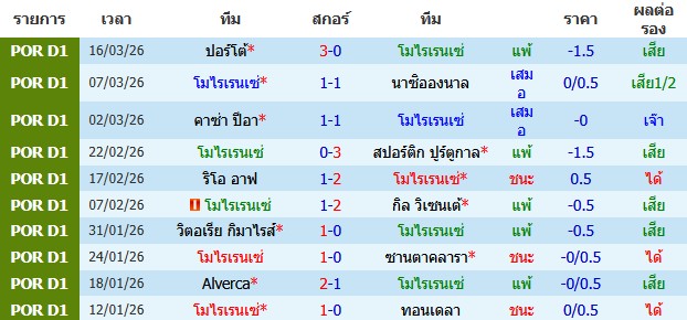 ผลงาน 10 นัดหลังสุดของทีม โมไรเรนเซ่