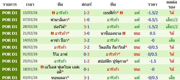 ผลงาน 10 นัดหลังสุดของทีม อารัวก้า