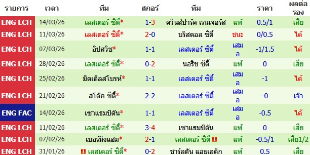 ผลงาน 10 นัดหลังสุดของทีม เลสเตอร์ ซิตี้