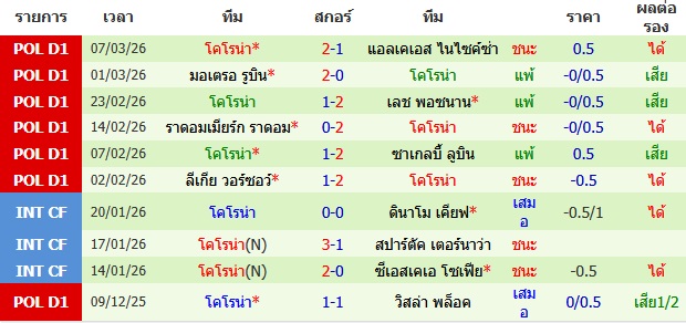 ผลงาน 10 นัดหลังสุดของทีม โคโรน่า