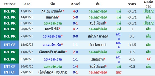 ผลงาน 10 นัดหลังสุดของทีม วอเตอร์ฟอร์ด