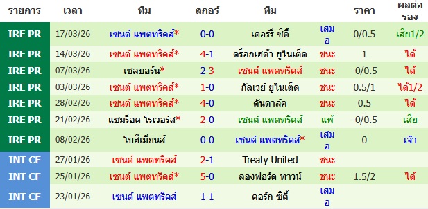 ผลงาน 10 นัดหลังสุดของทีม เซนต์ แพตทริคส์